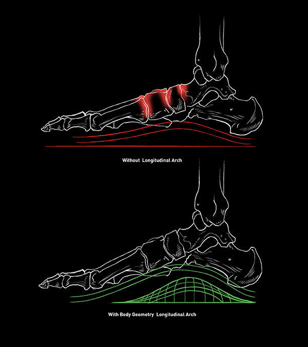 The foot is built like a leaf spring. Great for running. Bad for riding. Body Geometry shoes are designed with patented, molded arch support in the outsole to create a rigid structure, which is paired with customizable footbeds to prevent foot collapse and increase power.