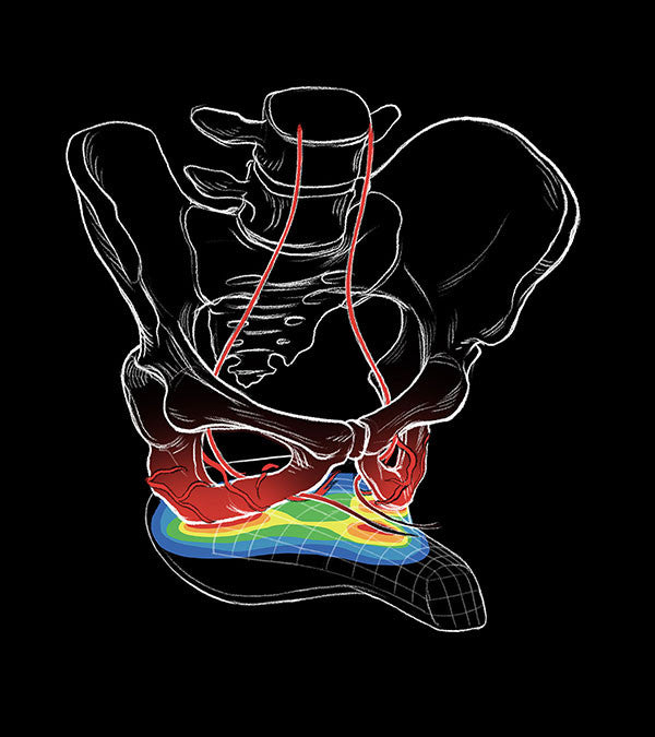 The traditional saddle’s rounded nose creates high pressure in soft tissue, seen here as red and yellow, resulting in pain, scar tissue, and real medical issues like erectile dysfunction and swelling and numbness in the labia.
