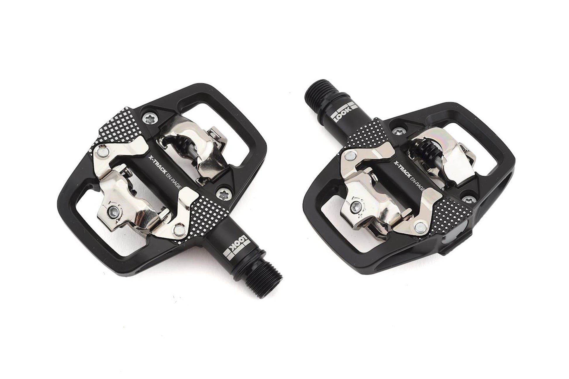 Designed with a wide clipless platform, the Look X-Track En-Rage Pedals improve stability and grip when you're dropping into steep, rock-strewn terrain and pedaling swiftly along fast flow trails. As a relatively new addition to Look's mountain bike line, the X-Track En-Rage provides an intuitive interface that's both easy to clip into and release from, as well as one that's adjustable in tension with the quick turn of a screw. This is the smaller sibling to the larger X-Track En-Rage Plus, making it ideal for aggressive trail rider seeking a bit less weight and smaller platform. Compared to skinnier X-Track En-Rage Plus designed for enduro racing, the X-Track En-Rage saves you approximately 30 grams for the pair of pedals, which is pretty significant when you're counting every last gram going on your trail bike. The forged alloy body and chromoly spindle provide high levels of strength and durability when you're thrashing them on the trail. Textured pins along the sides improv...